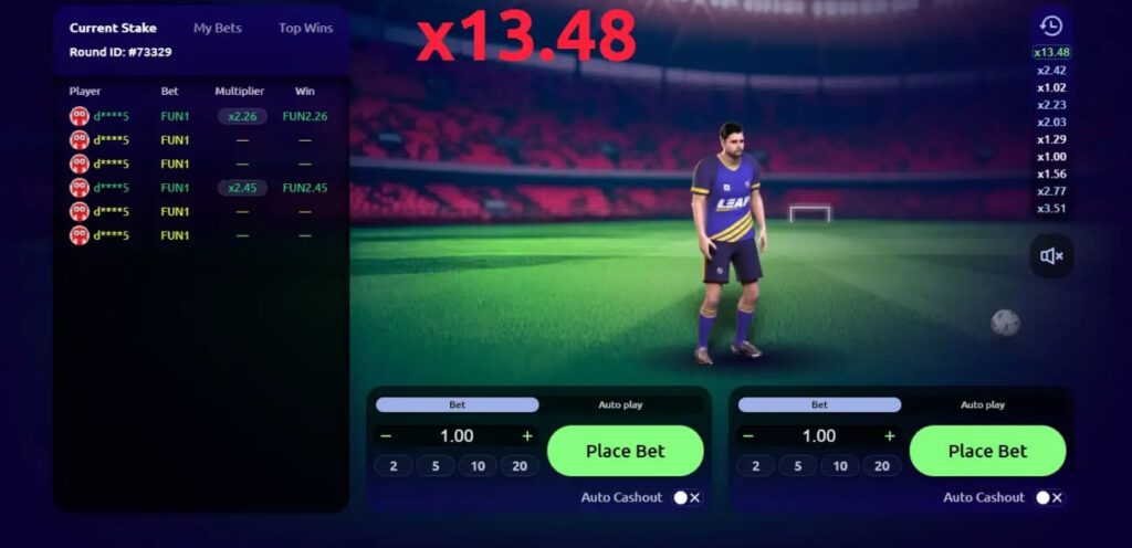 During the active round, the animated freestyler initiates their routine, keeping the ball aloft through various tricks involving feet, head, and chest. Simultaneously, a multiplier commences its ascent from a base of 1.00x, increasing continuously. The player's objective is to manually trigger a “cash out” before the freestyler fumbles and the ball drops โ the “crash” event that concludes the round. If a player successfully cashes out, their initial stake for that bet is multiplied by the value displayed at the precise moment of withdrawal. Failure to cash out before the crash results in the loss of the stake for that bet. The round can also conclude if the multiplier reaches its predefined ceiling.