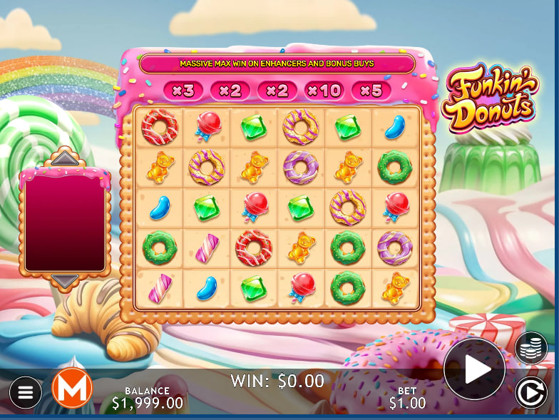 Funkin’ Donuts by Massive Studios delivers a vibrant confectionery world built upon a 6×5 grid. This slot game utilizes a cluster pays system complemented by cascading reels, where winning symbols vanish to make way for new ones. The core gameplay revolves around an intricate multiplier system, with values up to x200 appearing above the reels to enhance 2×2 symbol clusters. A Super Multiplier feature can further amplify these values or add its own to qualifying clusters. The main attraction, the Free Games round, introduces a Total Win Multiplier Meter that accumulates all applied multipliers for potentially significant payouts. With a base game RTP of 96.65% and a maximum win potential reaching up to 30,000x the stake via special features, Funkin’ Donuts offers engaging mechanics beyond its sweet visuals. Players can also opt for Game Enhancers or direct Bonus Buys for varied gameplay experiences.