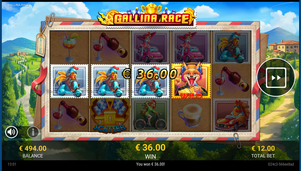 “Gallina Race” operates on a standard 5-reel, 3-row grid layout, featuring 30 fixed paylines that pay from left to right. This conventional structure makes the game immediately accessible to players familiar with online slots while providing enough paylines to facilitate frequent winning combinations.