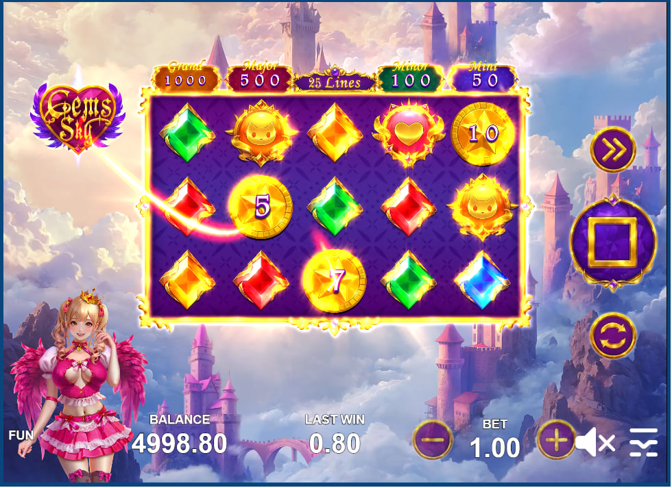 Zillion Games’ creation, Gems Sky, presents a tranquil pastel kingdom, a dreamlike realm populated with vibrant gem symbols and endearing characters. This slot operates on a 5×3 reel layout encompassing 25 paylines, delivering a visually soothing and gentle gaming session. Contrary to its soft appearance, Gems Sky incorporates a multifaceted bonus structure that includes Free Spins, a dedicated Bonus Game, and a Wheel of Fortune feature, granting diverse avenues for potential payouts. The fundamental gameplay is dynamically enhanced by a Random Wild feature, which unexpectedly elevates winning possibilities. The overall game atmosphere is designed for relaxed enjoyment, while the Wheel of Fortune mode introduces the potential for securing fixed jackpots. Gems Sky effectively merges an approachable aesthetic with engaging mechanics, making it a distinctive and well-rounded slot experience.