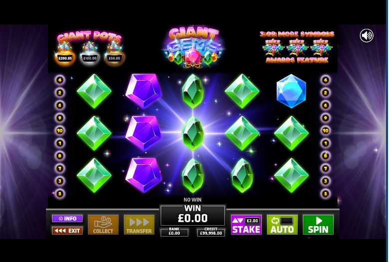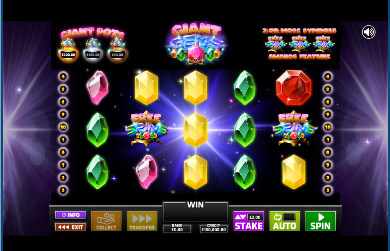 The trigger for these jackpots is linked to the appearance of special “Giant Gems” logo symbols that can overlay any standard gem symbol during a spin. According to the game's information panel, landing three or more of these overlay symbols anywhere on the reels in a single spin awards one of the pots. The specific prize is determined by the number of overlay symbols that land: