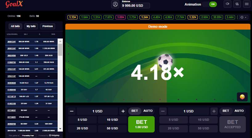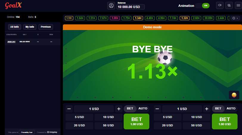GoalX stands apart from traditional crash games by incorporating a soccer theme and offering an innovative dual betting system. The game's distinguishing feature is its ability to handle two simultaneous bets per round, giving players enhanced control over their gaming strategy and potential winnings.