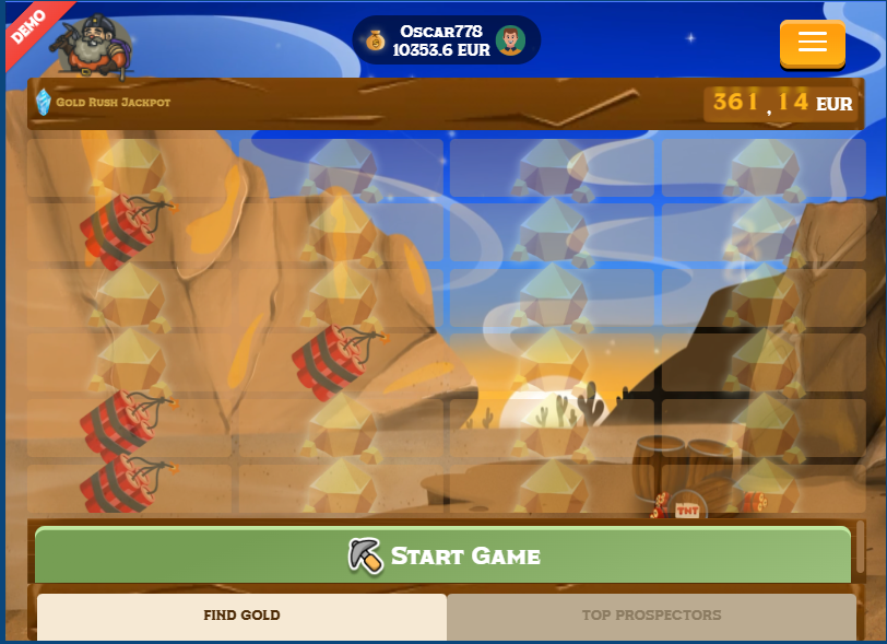 Opulent Valley (Easy): This setting, depicted with a bright, daytime desert landscape, represents the lowest risk level. The game grid will contain the fewest dynamite symbols. Consequently, the payout multiplier for each successfully uncovered gold nugget will be smaller. This mode is structured for players who prefer a longer session with more frequent, albeit smaller, accumulations of winnings. The strategy here revolves around methodically building a modest pot over many successful picks.