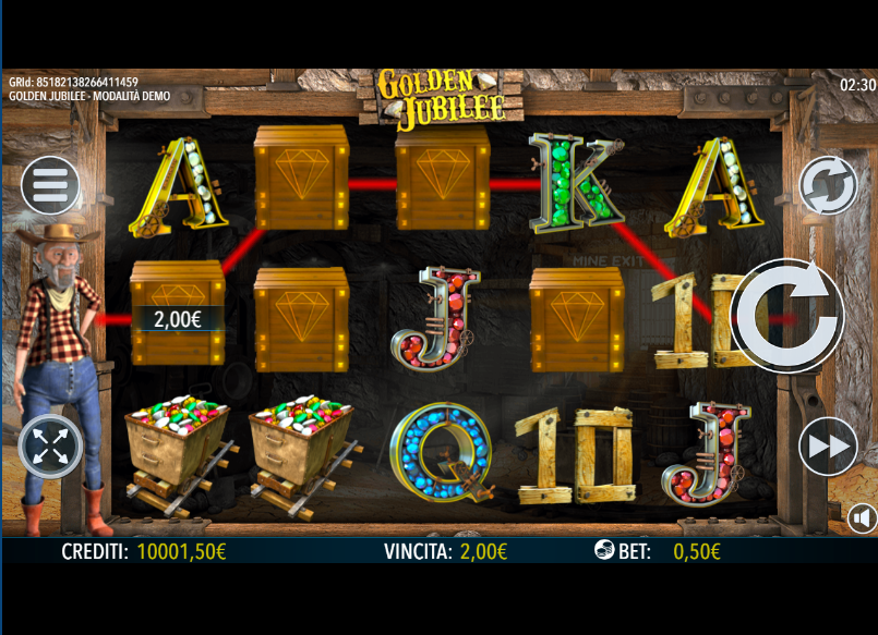 Golden Jubileeโs visual presentation is functional and adheres closely to the established conventions of the gold-mining genre. The game is set within the dark interior of a mine shaft, with heavy wooden beams reinforcing the top of the screen and the faint outline of a mine exit visible in the background. The color palette is dominated by dark, earthy tones, which serves to make the brighter, more valuable symbols on the reels stand out. To the left of the reels stands a 3D-animated figure of a classic prospector. His presence adds a dynamic element to the otherwise static background, though his animations are simple and recur in a limited loop. He reacts to wins and other game events with subtle gestures, serving as a visual anchor for the player.
