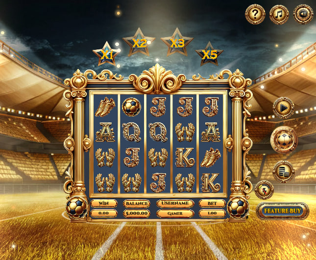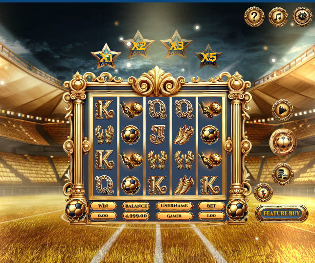 The symbol hierarchy is straightforward, reinforcing the game's theme. High-value symbols are represented by golden artifacts of the sport: a boot striking a ball, a standalone ball, cleats, and goalie gloves. The low-value symbols are the standard card royals (J, Q, K, A), though they are designed in the same ornate, gilded style to maintain visual coherence. A Wild symbol, depicted as a golden goal frame, substitutes for all other symbols except the Scatter. Its appearance is limited to reels 2, 3, 4, and 5, a standard but important restriction that prevents it from initiating combinations on its own.