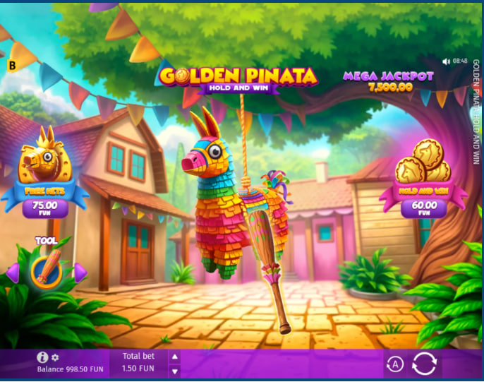 BGaming's Golden Pinata Hold and Win presents an immediate deviation from conventional slot structures, offering a gameplay loop centered on direct interaction rather than passive reel observation. The visual presentation is a vibrant, sun-drenched Mexican village square, where a prominently featured,彩虹色的 (cǎihóng sè de – rainbow-colored) piñata serves as the focal point of all player activity. This design choice establishes a festive, celebratory atmosphere from the outset, effectively setting the stage for a game that prioritizes a singular, engaging action: striking the piñata to reveal potential rewards.