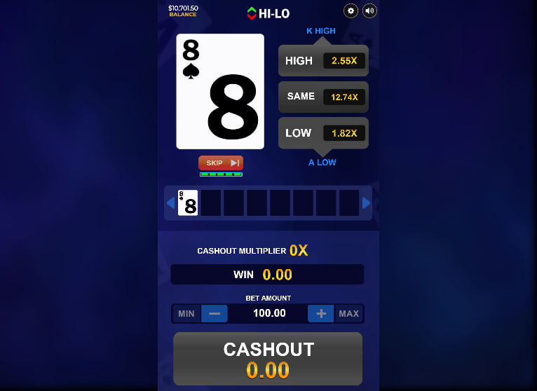 From the second round onwards, players gain access to a limited number of “Skip” uses per round, capped at five. This limitation introduces an element of resource management. Players must decide when it’s most advantageous to utilize a skip – perhaps when faced with a mid-range card where the “HIGH,” “LOW,” and “SAME” odds are less favorable, or when attempting to preserve a high multiplier for a later, more critical guess. The ability to refresh the board without penalty, up to a limit, adds a tactical dimension, preventing the game from becoming a purely binary “guess or lose” scenario. It encourages thoughtful progression and rewards players who can effectively manage their “skips.”