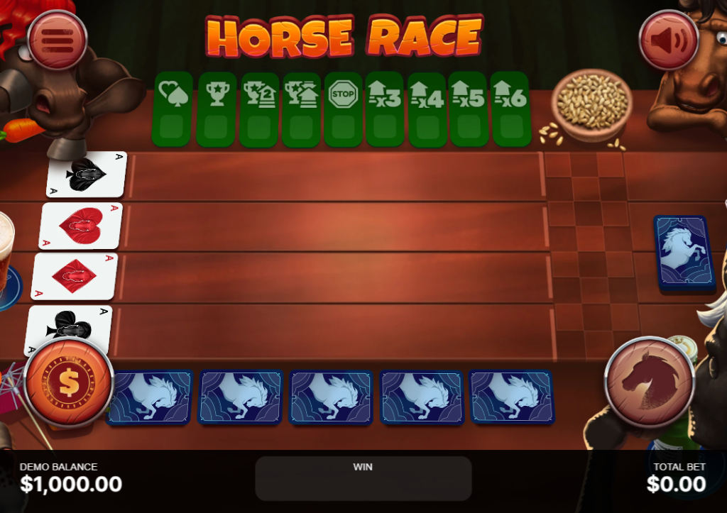 Horserace by Playnetic reimagines card racing through an innovative table game format using a standard 52-card deck. The game features four Aces racing across five steps, with hidden punishment cards creating strategic depth and unexpected reversals. Offering an RTP of 96.22%, Horserace combines straightforward mechanics with complex betting options ranging from simple color bets at 1.9:1 to rare achievement wagers paying up to 2100:1. The punishment system forces Aces to retreat when matching revealed cards, adding a layer of unpredictability to each race. Players can wager between 1 and 100 credits per bet, choosing from multiple betting strategies including suit selection, margin of victory, and consecutive movement sequences. The game’s clean interface prioritizes functionality over flashy graphics, focusing on clear race tracking and card information display.