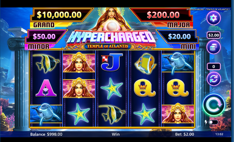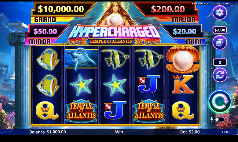 Hypercharged Temple of Atlantis features a four-tiered jackpot system. The Mini, Minor, and Major jackpots are fixed values, prominently displayed above the reels, and can be won through their respective Pearl symbols during the Hold and Spin features. The Grand Jackpot is a progressive prize, seeded at $10,000.00. It is funded by a 1.00% contribution from each qualifying bet (bets of $2.00 or higher). The Grand Jackpot can only be won by landing the specific “GRAND” symbol during the Hypercharged Hold and Spin feature when triggered from the base game.