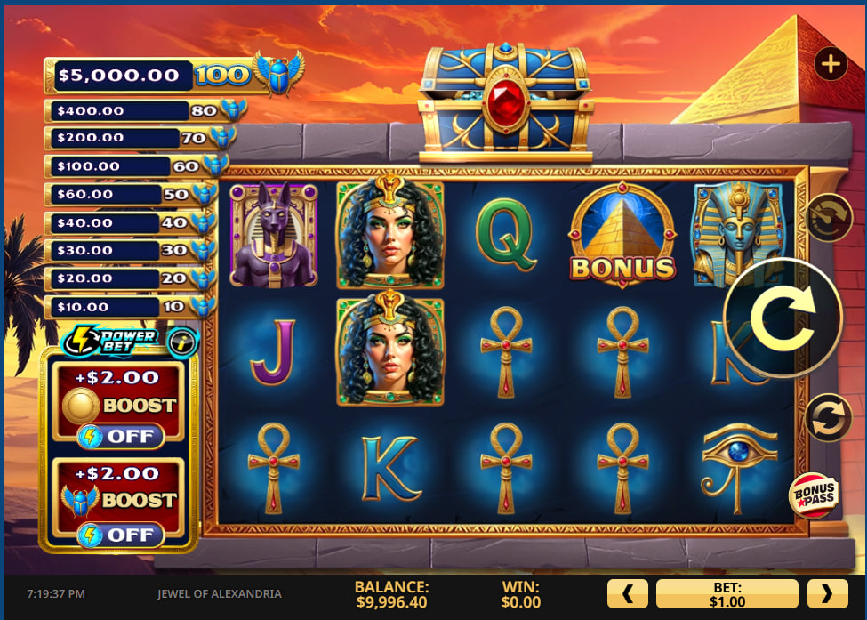 Jewel of Alexandria, developed by High 5 Games, offers a slot experience that moves beyond superficial themes, providing a rich gameplay experience through its multi-faceted bonus features and strategic betting choices. While aesthetically pleasing and thematically consistent, it is the complex interplay of Scatter Loot Link and Scarab Loot Link, along with the player-driven choices offered by the Power Bet options, that define the true essence of this game. It appeals to players seeking a deeper level of engagement and strategic consideration in their online slot entertainment, offering both visual appeal and intricate mechanics within a well-realized Egyptian setting.