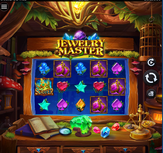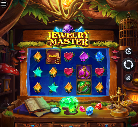 The foundational design of Jewelry Master is a 5-reel, 3-row grid, offering 10 fixed paylines that remunerate from left to right. The game operates with a stated Return to Player (RTP) of 94.68%, a figure that experienced players will note is somewhat below the current industry median. This RTP is a critical factor to weigh against the game's feature set and potential payout structures. The symbol hierarchy is thematically consistent: higher valuation is assigned to intricately designed jewelry pieces – a golden Ring with a blue gem, a red Amulet, an Emerald Ring, and purple Earrings. Lower-tier symbols are represented by stylized gem versions of card suits – Club, Heart, Diamond, Spade – along with a Star, all rendered to fit the workshop aesthetic.