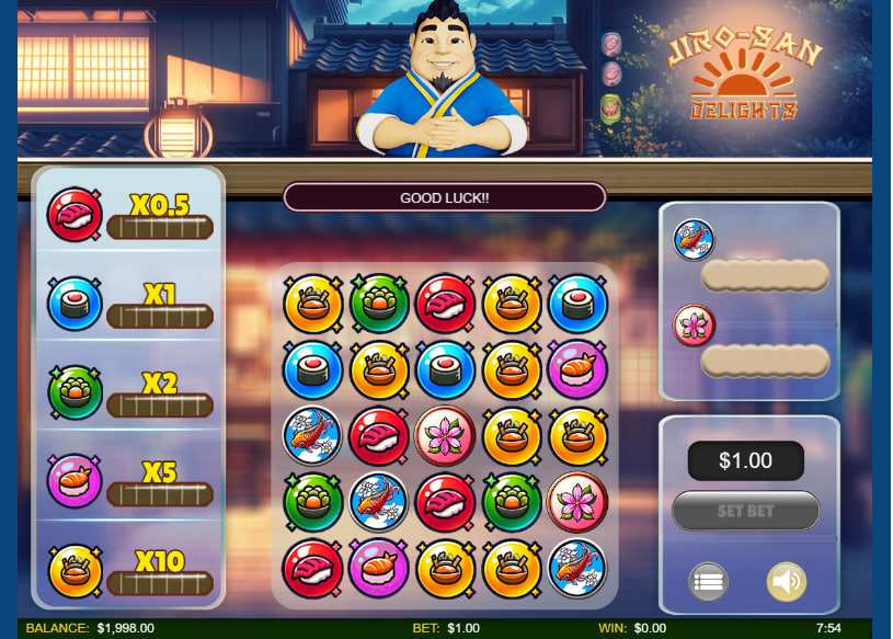 The fundamental interaction within Jiro-San Delights involves a 5×5 grid where various sushi-themed tiles cascade from above. Players initiate “blasts” by selecting clusters of three or more identical tiles connected either horizontally or vertically. Upon selection, these tiles are removed, and new tiles fall to fill the vacated spaces, potentially creating chain reactions. This cluster pays mechanic is central to the game's flow. Instead of paylines, the game focuses on collecting specific types of tiles to fill corresponding multiplier bars located to the left of the main grid.