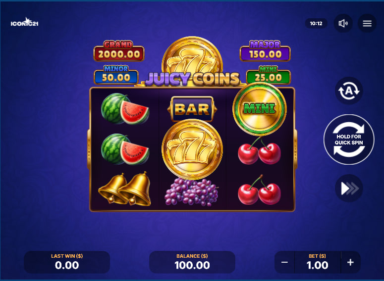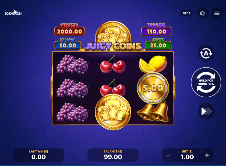 Juicy Coins presents a visual package rooted in classic slot tradition, built upon a 3×3 grid with five fixed paylines. At first glance, the familiar iconography of fruits, bells, and sevens suggests a straightforward experience. However, this initial impression is deceptive. The game's design philosophy channels the aesthetic of a high-limit Vegas slot machine, with its polished gold trim and a constant, prominent display of four fixed jackpots. This visual choice is not merely decorative; it signals the game's true mechanical focus, which lies far from conventional line hits.