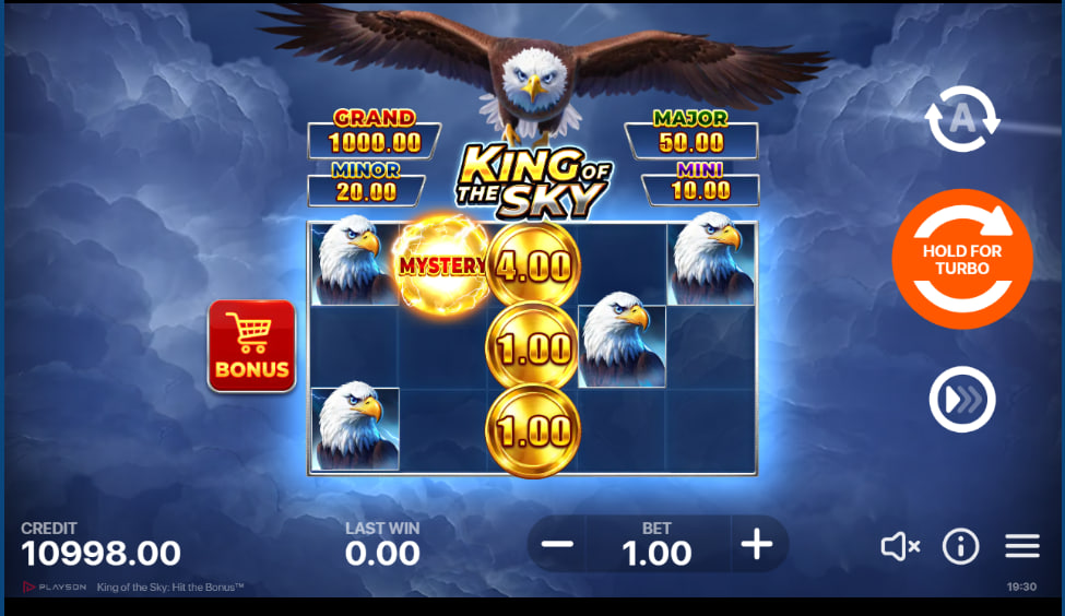 The mechanics of King of the Sky: Hit the Bonus are explicitly designed to drive players towards the bonus games. The main game's lack of regular symbols is a highly unusual design choice, fundamentally shifting the player's focus. Every spin becomes a hunt for bonus triggers – either the standard Bonus symbol coins or the Eagle symbols. This structure immediately distinguishes King of the Sky from the vast majority of slots that rely on base game wins to sustain player engagement.