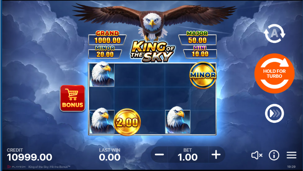 Playson’s King of the Sky: Hit the Bonus offers a distinctive slot experience centered around bonus features and majestic eagles. Set against a backdrop of vast skies, the game immediately sets itself apart by omitting regular symbols in the main play, driving directly towards bonus activation. Trigger the Golden Bonus Game for a coin collection ascent with respins, boost symbols, and mystery reveals. Alternatively, activate the Eagle Bonus Game which incorporates paylines and eagle-centric jackpots. Both bonus modes feature sticky symbols and the potential for multipliers. King of the Sky prioritizes bonus engagement, providing players with a focused path to enhanced gameplay and varied winning opportunities within two distinct bonus environments. This slot emphasizes a unique structure where anticipation builds solely on triggering and navigating the rich bonus game mechanics.