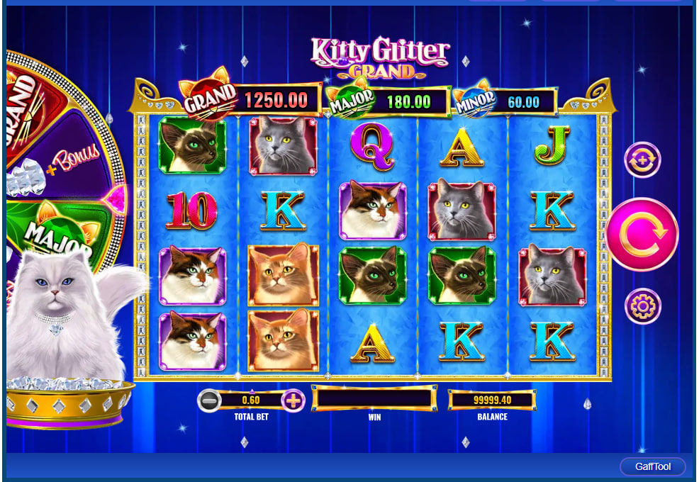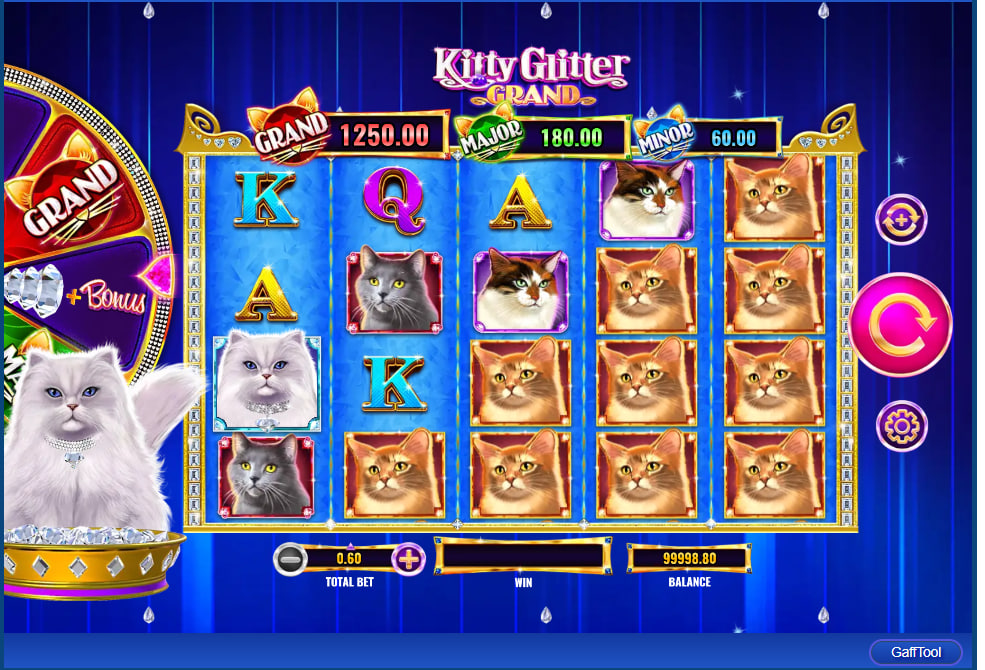 One notable feature of Kitty Glitter Grand emerges directly in the base game, triggered by the appearance of Diamond Scatter symbols, specifically when one or more lands on reel 5. This Random Wild Feature immediately distinguishes it from slots relying solely on bonus rounds for dynamic reel modifiers. Upon activation, after any potential line wins are calculated (and crucially, if the Wheel Bonus is not triggered), the game selects one of the five premium cat symbols – the White Persian, Orange Tabby, Calico, Gray Shorthair, or Siamese – to become wild. All instances of the chosen cat symbol on reels 2, 3, 4, and 5 then transform into wild symbols.