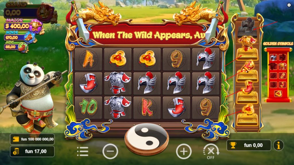 - Wild Symbol: Represented by a panda warrior, the Wild substitutes for all other symbols except the Scatter and Pearl Multiplier and appears only on reels 2, 3 and 4. It also triggers the Jackpot feature, a vital element for hitting larger payouts.