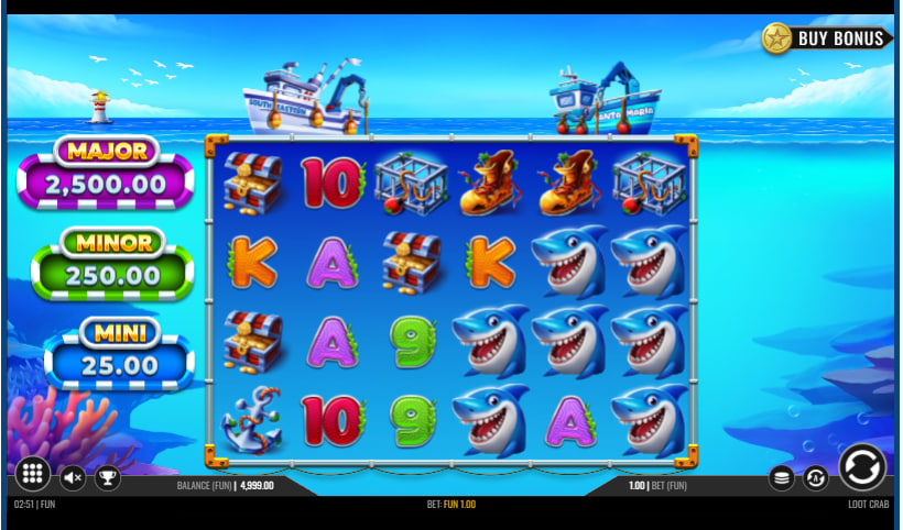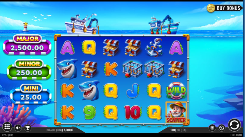 Iron Dog Studio’s Loot Crab offers a digital dive into an animated oceanic realm where crustaceans and submerged treasures define the primary gameplay experience. The visual presentation adopts a cheerful, cartoon-like aesthetic, with a vibrant blue seascape forming the backdrop. Fishing boats bob on the surface above, hinting at the mechanisms that occasionally shower down opportunities onto the reels. The overall atmosphere is light-hearted, eschewing gritty realism for a more playful depiction of underwater bounty hunting. Accompanying audio effects generally complement the aquatic theme, with splashes and bubbly sounds punctuating reel spins and winning outcomes.