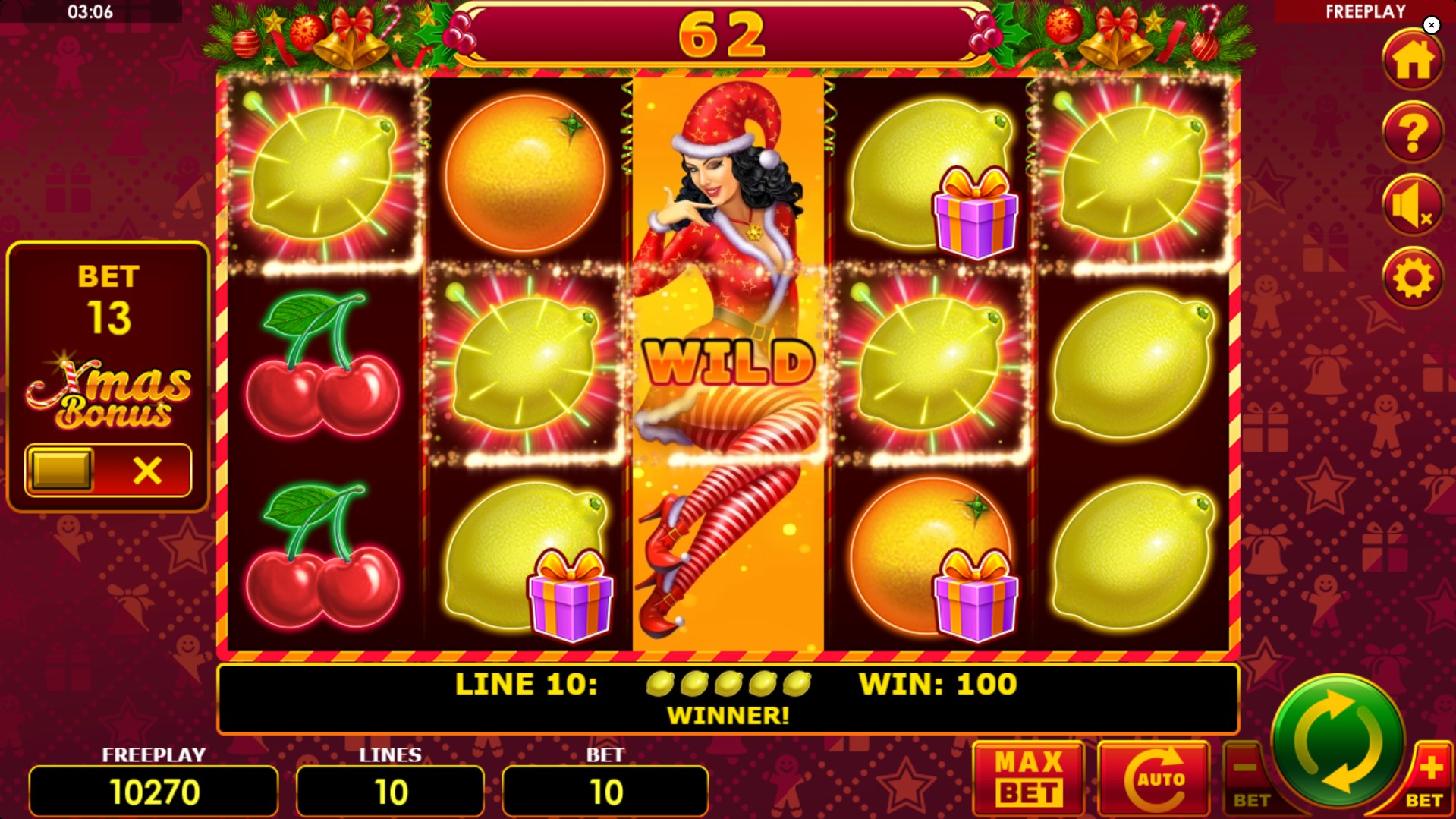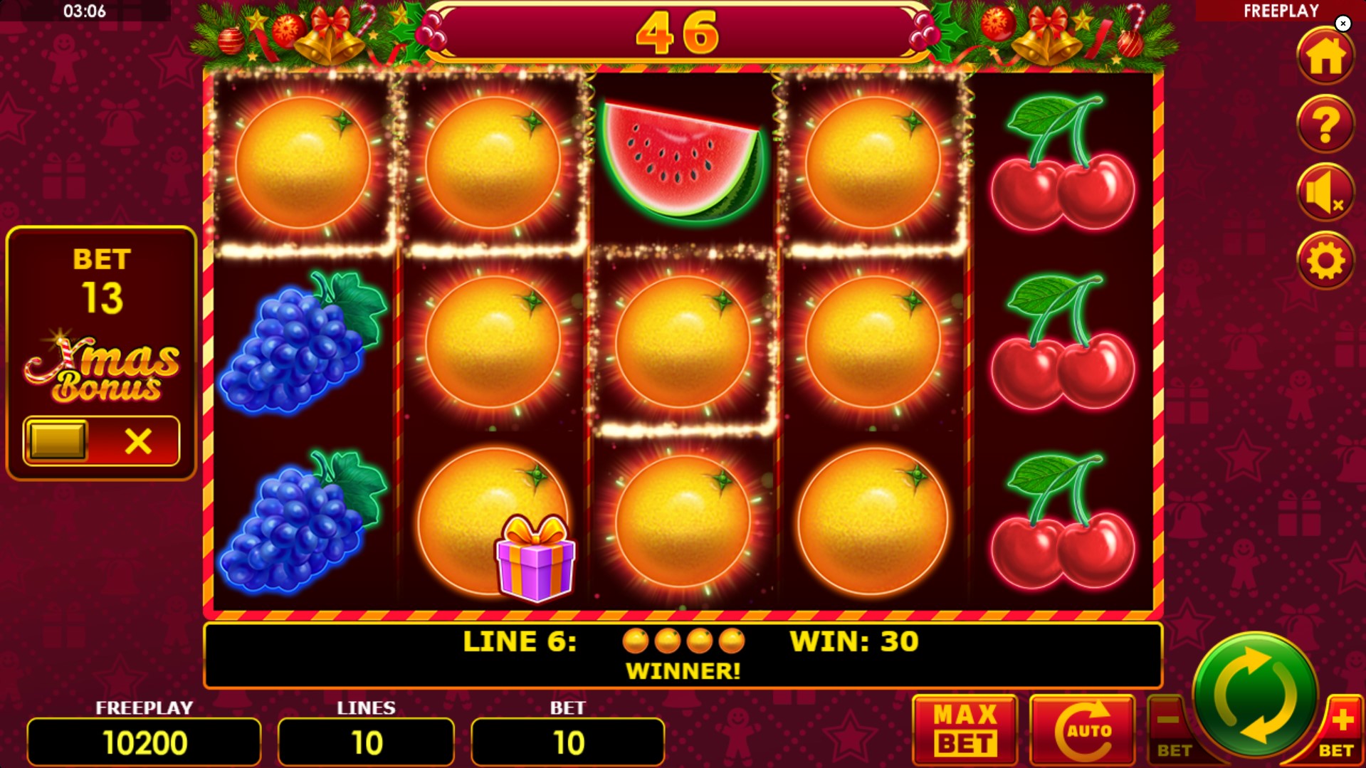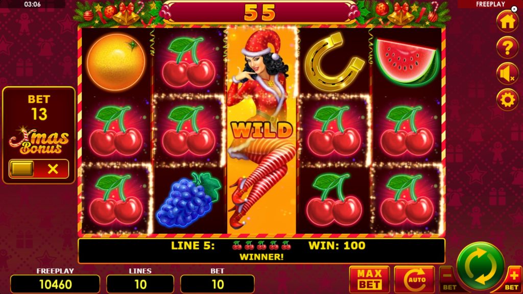 The visuals are a colorful mix of traditional fruit symbols and holiday cheer. You will see the familiar lucky 7s, watermelons, grapes, plums, oranges, lemons, and cherries alongside horseshoes, bells, and stars. These symbols are rendered with a polished, modern aesthetic that keeps them feeling fresh despite their classic origins. The game's sound design further enhances this festive atmosphere with a cheerful soundtrack.