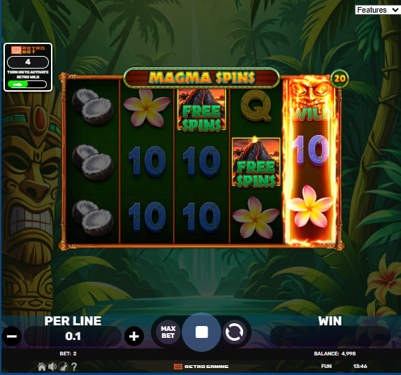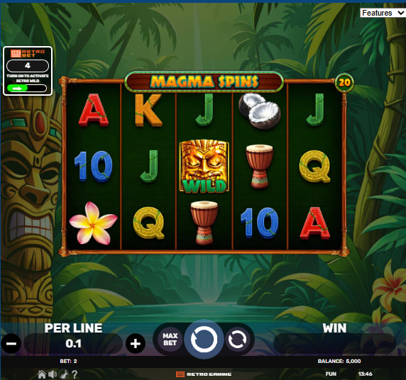 Retro Gaming’s Magma Spins invites players to a lush jungle backdrop where a volcano simmers. This 5×3 slot features 20 paylines and a distinct tropical and retro atmosphere. The core gameplay is enhanced by the presence of a Tiki Mask Wild symbol, substituting for others to form wins, and Mystery Symbols that reveal random icons. The game’s standout element is the Retro Bet feature, which costs an additional bet but activates sticky wilds on the middle reel, increasing winning potential during the base game. Triggering the Free Spins bonus with three or more scatters awards up to 50 free games, with a significant advantage if the Retro Bet was active, locking the sticky wilds throughout the round. This combination of features offers a unique, engaging experience for players seeking a slot with strategic depth and a dynamic bonus structure.