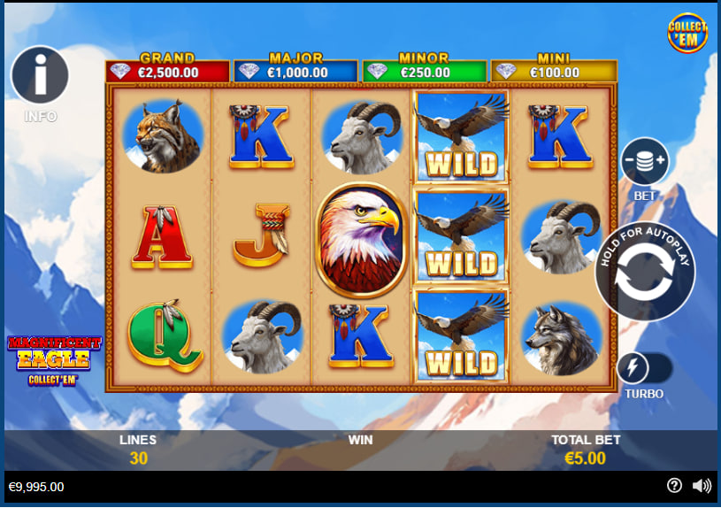 Magnificent Eagle: Collect’Em™ by Playtech offers a journey into a North American wilderness theme, depicted with a clear and classic visual style. The game atmosphere centers on natural grandeur, focusing on iconic wildlife symbols across its 5-reel, 3-row layout. Core gameplay revolves around 30 fixed paylines and the pivotal Collect’Em™ mechanic. This central feature involves a special symbol on reel 5 (or any reel during free spins) gathering various coin symbols for instant cash prizes, entry into the Free Games round, or chances at fixed jackpots. The Free Games feature enhances play with locking and walking Collect’Em™ symbols. Players will observe a theoretical Return to Player (RTP) of 92.42%. The primary bonus activations stem from successfully landing the Collect’Em™ symbol alongside prize-bearing coins. This slot concentrates heavily on its collection dynamic for engagement.