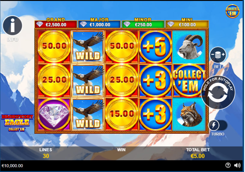 Magnificent Eagle: Collect'Em™ is a slot that dedicates itself almost entirely to its central collection feature. The interplay between the Collect'Em™ symbol and the various coin types forms the backbone of both the base game excitement and the more dynamic Free Games round. The potential for multiple walking Collect'Em™ symbols during free spins, each hoovering up prizes, presents the most compelling aspect of the gameplay. The addition of the four fixed Collect'Em™ Prizes adds another layer of chase, particularly when Diamond coins make an appearance.