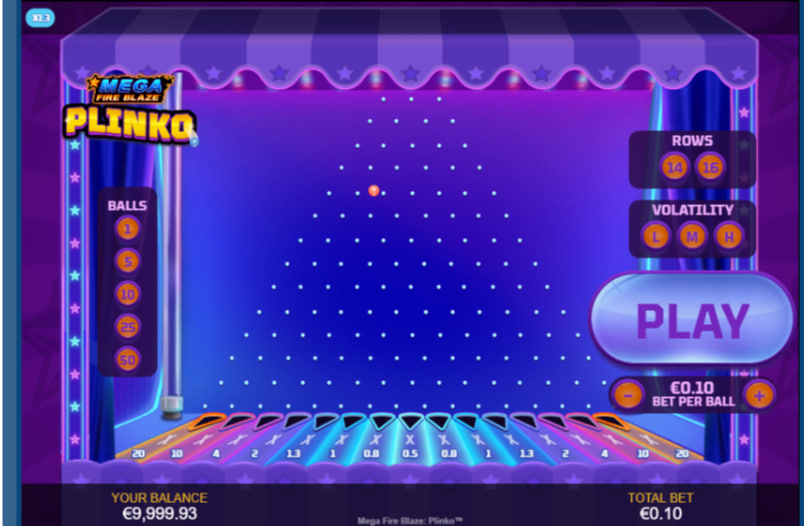 Mega Fire Blaze: Plinko by Playtech adapts the classic Plinko prize drop concept into an online game format with a vibrant neon arcade atmosphere. Players release balls onto a selectable 14 or 16-row pinned pyramid grid. The core interaction involves watching the ball navigate the pegs via simulated physics to land in prize slots below. A distinct characteristic is the player’s ability to choose Low, Medium, or High volatility, directly altering the multiplier values and risk profile of the grid. This title integrates Playtech’s well-known Fire Blaze and Mega Fire Blaze hold-and-respin style bonus rounds. These bonus features activate when a ball lands in specially marked slots, offering chances for accumulated cash prizes and fixed jackpots. The game’s theoretical RTP varies between 95.41% and 96.44% depending on the chosen settings. It provides a different gaming dynamic compared to standard reel-based slots, emphasizing configurable probability and visual path anticipation.