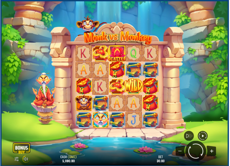 The base game of Monk vs Monkey operates on a 1024 ways-to-win engine. This means that winning combinations are formed by matching symbols on any position on adjacent reels, starting from the leftmost reel. This system eliminates the constraints of fixed paylines and makes the position of a symbol on its reel (top, middle, or bottom) irrelevant, as long as it is part of a sequence from left to right.