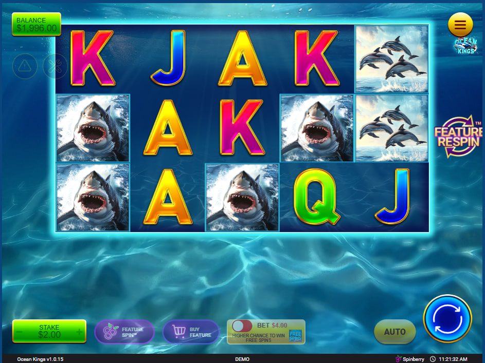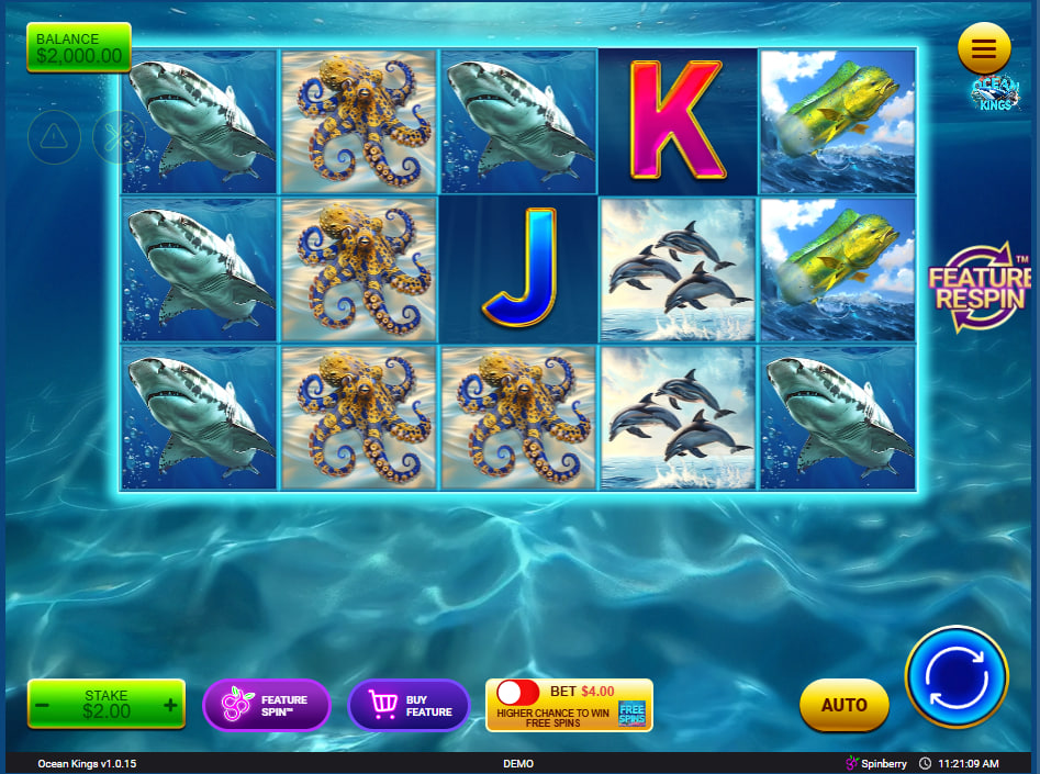 Spinberry’s Ocean Kings positions players within a dynamic marine environment featuring powerful apex predators and turbulent surface waves. The action unfolds across a 5-reel, 3-row grid utilizing 20 fixed paylines for win evaluation. Core gameplay centers on forming combinations with detailed symbols representing marine life and card ranks. Launched on July 21, 2023, the slot incorporates Spinberry’s signature mechanics. Ocean Kings operates with high volatility, suited for players pursuing substantial win potential. The game provides a 96.00% theoretical return to player percentage. A proprietary Feature ReSpin™ mechanic creates specific opportunities for enhanced gameplay during base spins. Players access the Free Spins bonus round through either an increased Feature Spin bet for boosted probability or a direct purchase option.