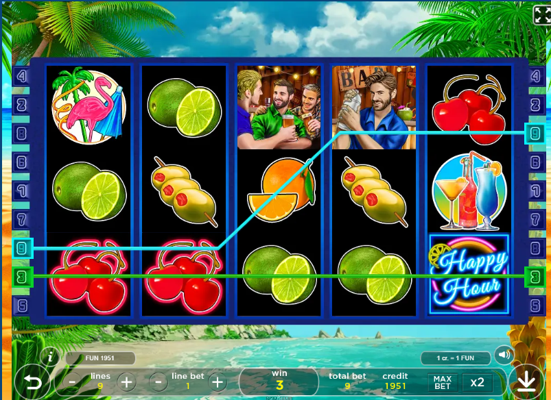 Animations are functional and serve to highlight events on the screen. Winning paylines are clearly traced with bright, colored lines that correspond to the line markers on the sides of the reels. The winning symbols themselves engage in simple, looped animations—the lime might spin, the strawberry might sparkle. The most pronounced animation is reserved for the “Happy Hour” Scatter symbol, which flashes with a realistic neon glow when it lands, effectively drawing the player's attention to the potential feature trigger. The overall effect is understated, prioritizing clarity and responsiveness over distracting visual spectacles. This design ensures that the focus remains squarely on the gameplay and the outcome of each spin.