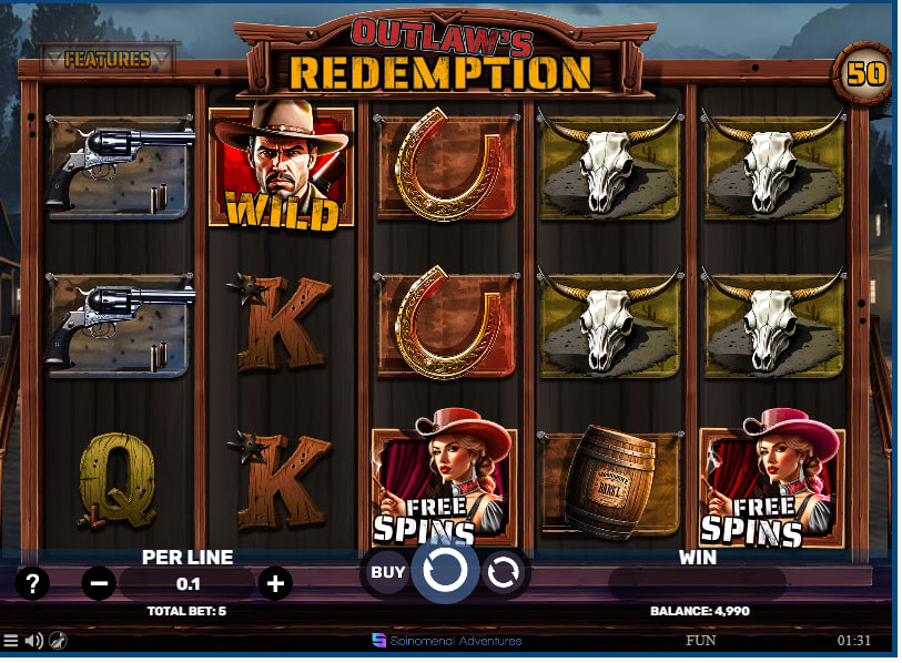 “Outlaw’s Redemption” operates on a 5-reel, 3-row grid, offering 50 fixed paylines. This structure provides a broad canvas for winning combinations, which pay from left to right, starting from the leftmost reel. Standard playing card icons – Jacks, Queens, Kings, and Aces – constitute the lower tier of payouts, crafted with a rugged, wood-grain finish to integrate them into the Western theme.