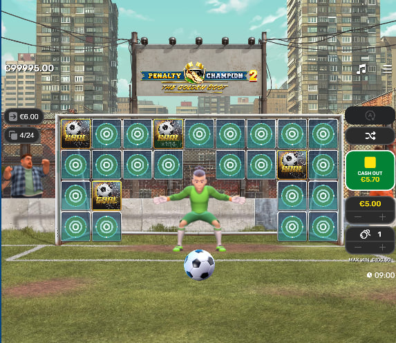 Experience the high-octane thrill of “Penalty Champion 2: The Golden Boot,” a unique slot from Gaming Corps that places you center stage in a dramatic penalty shootout. Set against a gritty urban backdrop, this game eschews traditional reels for a dynamic 5×5 grid of concealed tiles. Players engage by selecting tiles, aiming to uncover goals or the lucrative golden boot while strategically avoiding the goalie’s saves. The core gameplay hinges on a calculated risk-reward system, allowing players to cash out their accumulated winnings at any point or push their luck for larger payouts. The RTP stands at a competitive 97.04%, offering favorable long-term prospects. The standout bonus feature, the Golden Boot, can trigger a cascade of additional goal reveals, significantly boosting your win potential. This title delivers an immersive, skill-influenced gaming session for those seeking a distinct alternative to standard slot mechanics.