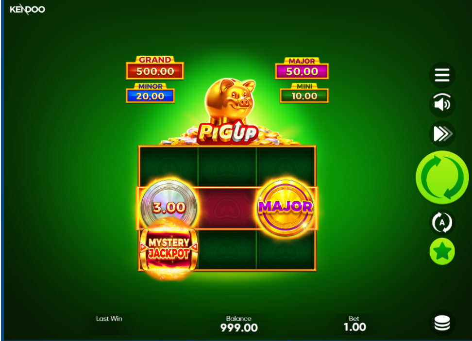 Jackpot Prizes: Mini, Minor, Major, Grand: Pig Up features four fixed jackpots displayed prominently above the reels: Mini, Minor, Major, and Grand.