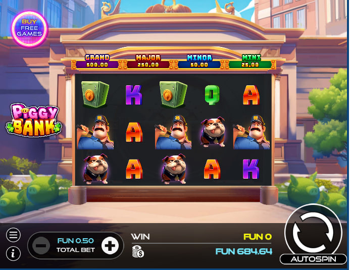 The “Piggy Bank” slot presents a lighthearted and visually appealing theme centered around, you guessed it, piggy banks and financial prosperity. The backdrop depicts a stylized urban environment, perhaps a bank or a bustling financial district, complete with buildings and greenery. The overall aesthetic is bright, clean, and modern, with a color palette that leans towards blues, golds, and vibrant pinks associated with the piggy bank motif. The symbols are well-designed, featuring characters like a friendly police officer and a determined bulldog, both seemingly guarding the bank's treasures. Other thematic symbols include safes, gold bars, and a dollar sign, all contributing to the atmosphere of wealth and security. The titular Piggy Bank symbol, which plays a crucial role in the bonus features, is rendered with a cute and inviting appearance, making it a welcome sight on the reels. The absence of overly complicated animations keeps the focus on the gameplay, while subtle visual cues and sound effects enhance the experience without becoming intrusive.