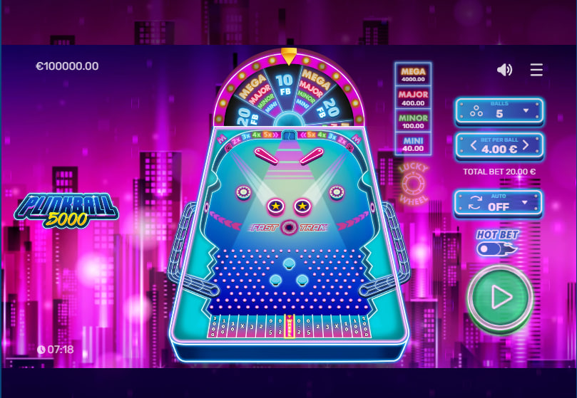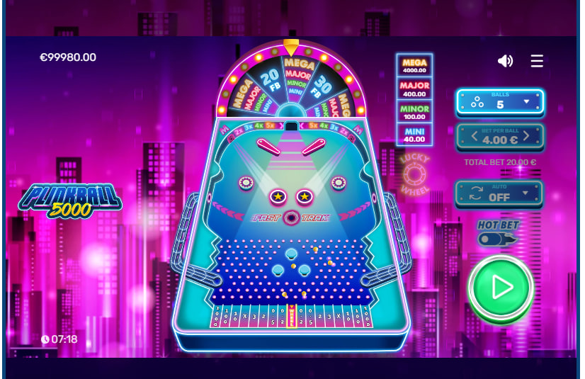 Plinkball 5000 by Gaming Corps offers an arcade-inspired amusement with a distinct retro-futuristic neon cityscape ambiance. This title diverges from conventional slot structures, presenting a vertical Plinko-style grid where balls navigate through a field of pegs. The core game involves releasing balls that cascade downwards, their paths randomized, aiming for prize trays or feature triggers at the base. It operates with a notably high base RTP of 97.00%, which can increase slightly to 97.09% when the Hotbet option is engaged. Central to its appeal are several interconnected bonus mechanics. The Lucky Wheel provides chances for instant cash prizes or free ball rounds. Additionally, the Multiplier Boost feature can augment winnings, while the Fast Trak alters a ball’s trajectory towards specific outcomes.