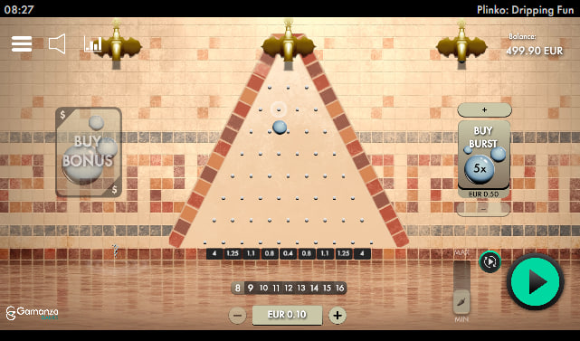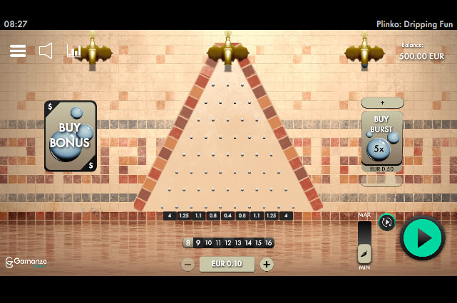 Gamanza’s “Plinko: Dripping Fun” presents a unique interpretation of the classic Plinko arcade game, setting its cascading action within a tranquil bathhouse environment inspired by Baden, Switzerland. This title deviates from typical high-energy presentations, offering a serene, tiled aesthetic where glistening “bubbles” descend a configurable pegboard pyramid. The core gameplay involves players releasing these bubbles to navigate pegs and land in multiplier slots at the base. “Plinko: Dripping Fun” features an adjustable volatility system (Low, Medium, High) and a variable RTP ranging from 93.26% to 96.72%. Players can customize the board with 8 to 16 rows, directly influencing outcome probabilities. A key “Buy Bonus” feature allows direct purchase of free drops, providing an alternative path to concentrated play sessions. The game’s mechanics also include a “Burst” option for releasing multiple bubbles simultaneously.