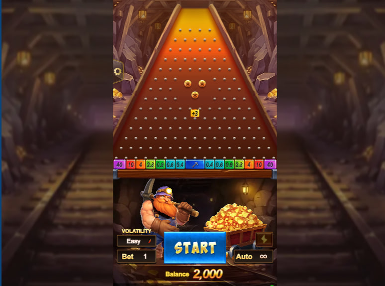 The game situates itself within a familiar mining motif. Visually, the backdrop depicts a somewhat stylized mine interior, complete with wooden supports, lanterns, and the glint of gold. The central Plinko board dominates the screen, designed to resemble a mine shaft entrance from a top-down perspective, tapering towards the prize receptacles at its base. A caricatured, bearded miner figure, pickaxe in hand, stands beside a cart overflowing with gold, observing the proceedings. This visual setup is functional, clearly delineating the play area and the thematic elements without excessive ornamentation.