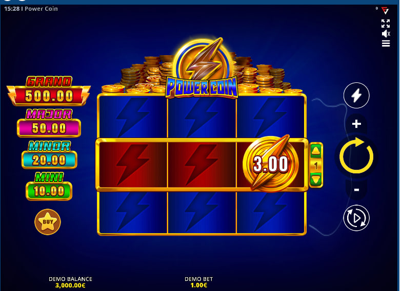 The game immediately immerses the player in an atmosphere of electrical energy and the pursuit of fortune. The backdrop features a deep blue gradient, punctuated by stylized lightning bolts that consistently hint at the power within the game's mechanics. The reels themselves are framed by a metallic gold, further emphasizing the theme of wealth and reward. The “Power Coin” logo, emblazoned with a powerful lightning bolt, sits prominently at the top, exuding a sense of dynamism and high-octane gameplay.