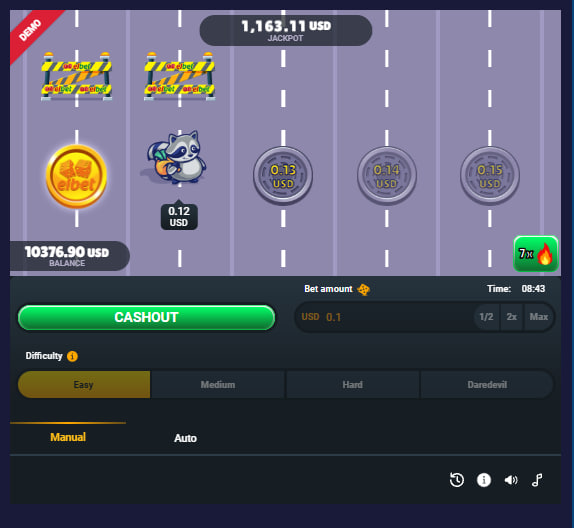 What distinguishes this title from many other crash games is the implementation of adjustable Difficulty Levels: Easy, Medium, Hard, and Daredevil. This is not a superficial feature; it is the primary tool for player strategy and risk management. Selecting “Easy” presumably lowers the probability of a crash event on any given lane, allowing for more consistent, albeit smaller, multiplier progression. Conversely, the “Daredevil” setting substantially increases the risk for a potentially much faster and larger multiplier growth. This allows players to tailor the game's volatility to their own risk tolerance, a level of control rarely offered in games of chance.