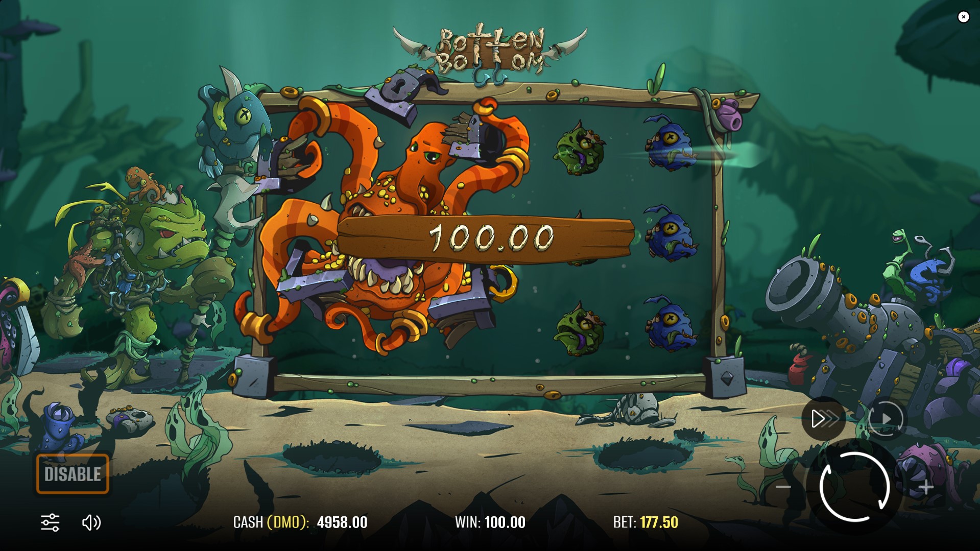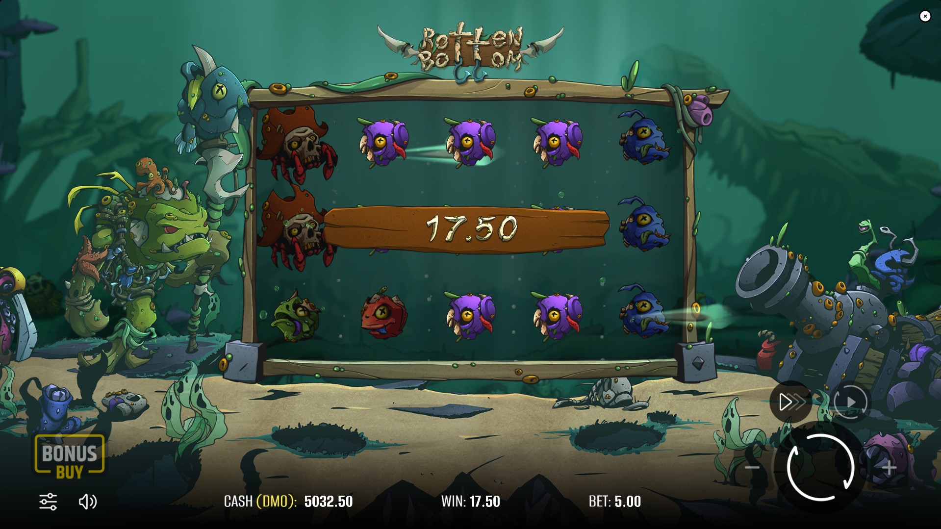 “Rotten Bottom” operates on a 5-reel, 3-row grid with 10 fixed paylines. Winning combinations are formed by landing 3 or more identical symbols on adjacent reels, starting from the leftmost reel. The game features 7 regular symbols, divided into high-paying and low-paying categories. The 4 low-paying symbols are depicted as various one-eyed sea creatures, colored red, green, blue, and purple. The 3 high-paying symbols include a spiky pink creature, a barnacle-encrusted fish, and a skeletal crab pirate. Payouts for these symbols vary, with the crab pirate offering the highest reward at 100 times the bet for a 5-of-a-kind combination.