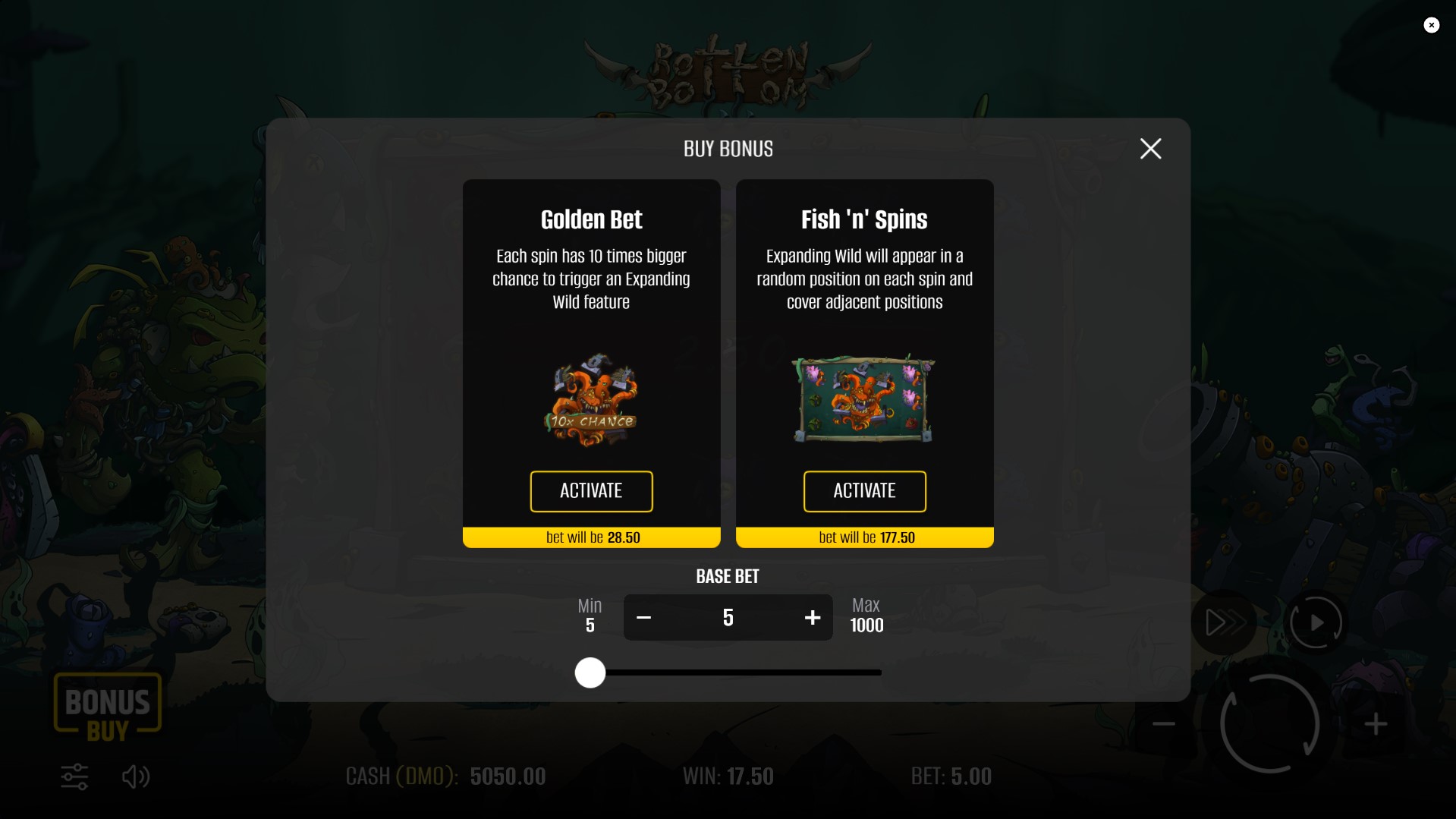 - The Fish ‘n’ Spins activation costs 177.50 when the base bet is 5.00.