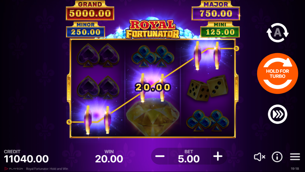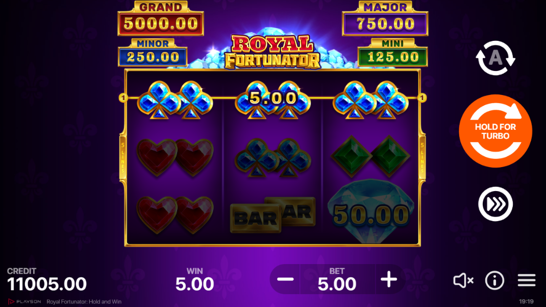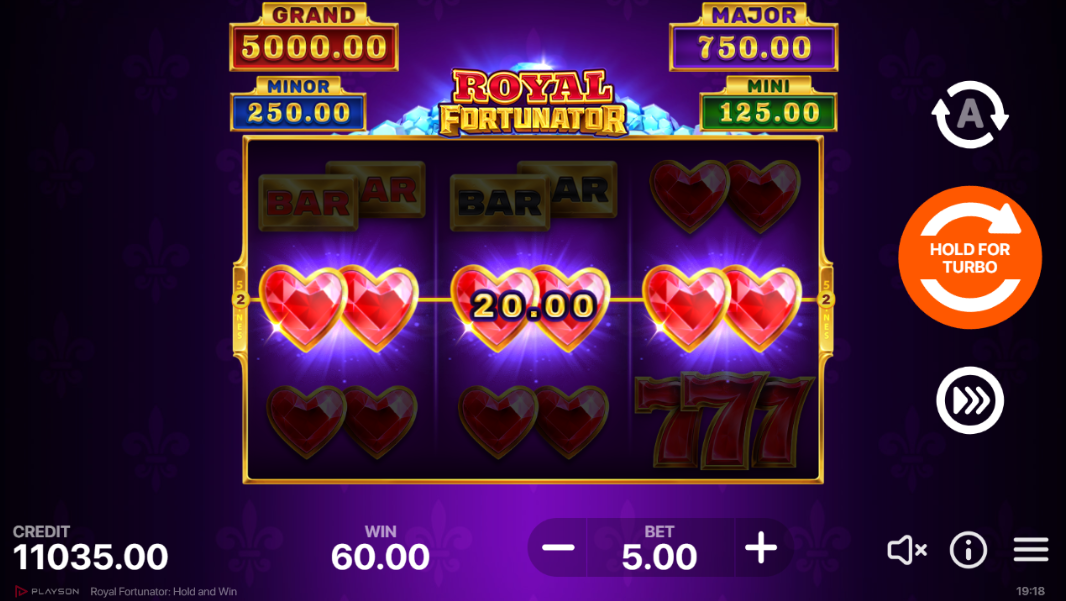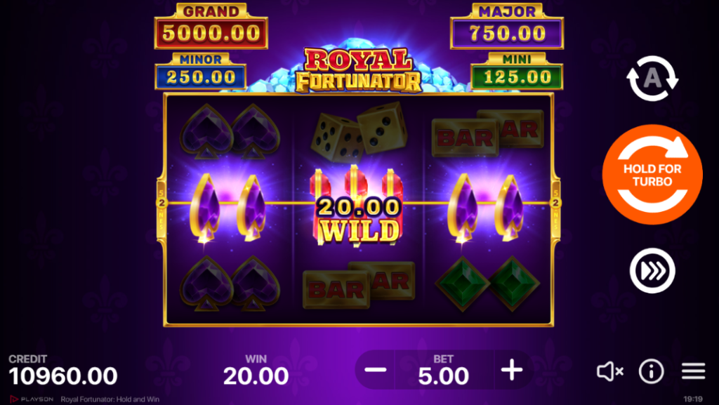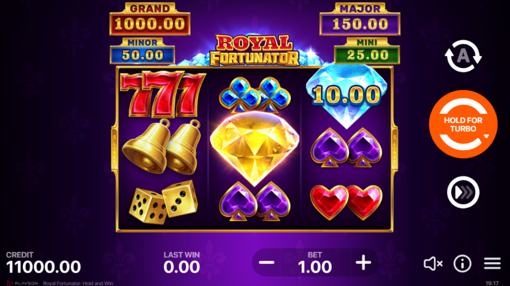 In Playson's Royal Fortunator: Hold and Win, traditional slot elements meet contemporary mechanics on a compact 3×3 grid. This high-volatility game stands out with its sophisticated purple and gold aesthetic, moving beyond typical fruit machine visuals while maintaining familiar gameplay elements.