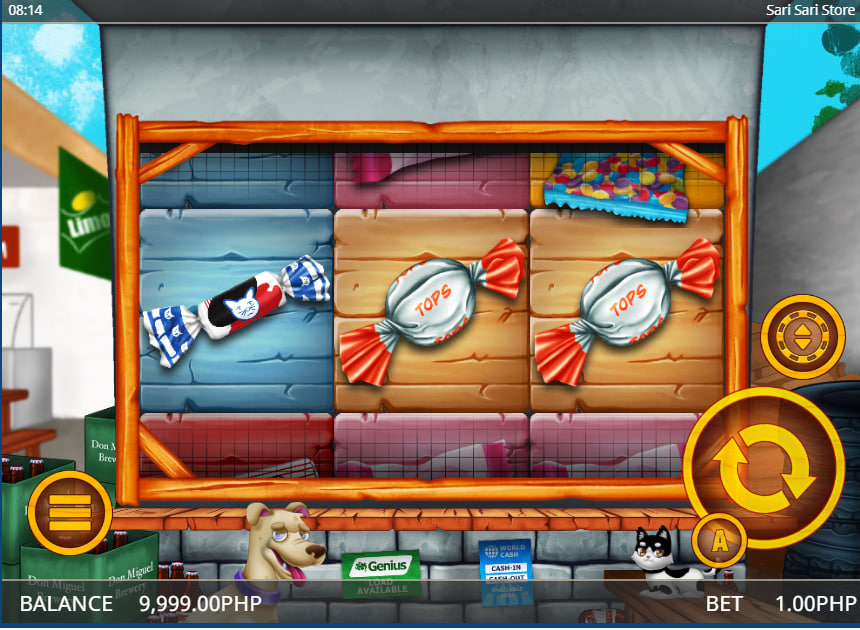 The game’s setting is a faithful and charming depiction of a Filipino sari-sari store, a small, family-run convenience shop commonly found in residential neighborhoods across the Philippines. This thematic choice moves away from generic fantasy or mythological tropes and grounds the game in a tangible, relatable cultural context. The execution is detailed and thoughtful, suggesting an authentic understanding of the subject matter. The game grid itself is framed as a wooden shelf, stocked with colorful candy symbols. The background extends beyond the reels, showing the store's interior with its corrugated metal walls and stacked boxes.