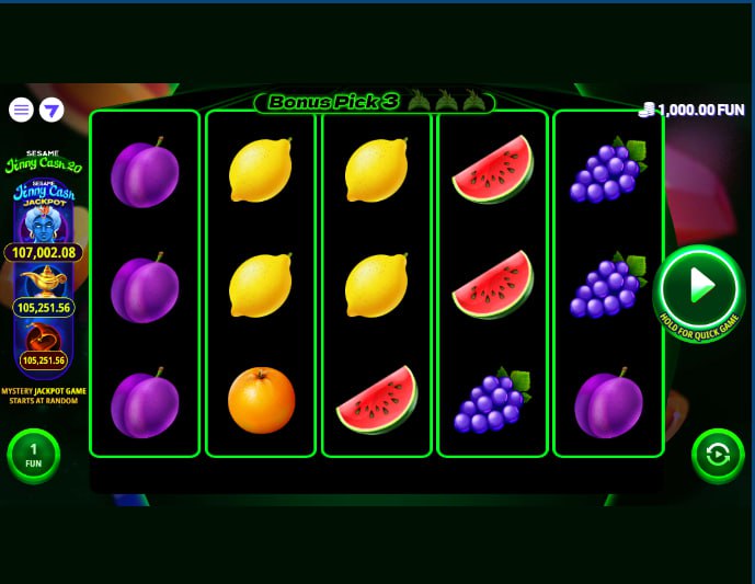 Sesame Jinny Cash 20 presents a digital iteration of classic slot machine aesthetics, featuring traditional fruit symbols and lucky icons. The game operates on a familiar 5-reel, 3-row grid, grounding its presentation in established slot formats. Action unfolds across 20 fixed paylines, requiring symbol matches on consecutive reels starting from the left for standard wins. Payout mechanics feature a theoretical return of 96.00%, balanced by a structure lending itself to moderate to high volatility. Key mechanics include a Multiplier Gamble offered after winning spins containing a Wild symbol, providing a choice to potentially increase payouts. Landing three or more Scatter symbols triggers the distinct PICK 7 Bonus Game. Within the PICK 7 game, players select items revealing multipliers applied to the total bet, offering an alternative path to significant rewards. Successfully uncovering specific Jackpot symbols during the PICK 7 feature awards the Jinny Cash Jackpot, the game’s highest fixed prize.
