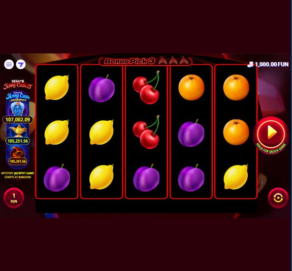 The aesthetic of Sesame Jinny Cash 5 is one of modern minimalism applied to a classic theme. The game avoids the pixelated, retro look of older fruit machines. Instead, the symbols—cherries, lemons, oranges, plums, grapes, and the high-paying 7—are rendered with a glossy, almost candy-like finish. The colors are bright and saturated against a deep purple background, ensuring high legibility and visual clarity. Animations are functional and understated. Winning paylines are clearly highlighted, and symbols involved in a win may pulse or glow, but there are no lengthy, distracting cinematic sequences. This focused approach keeps the pace of the game brisk and centers the player's attention on the reels and the critical post-win decisions.