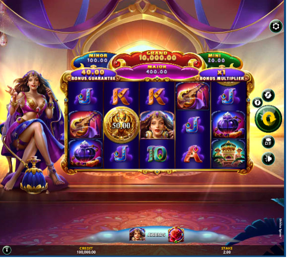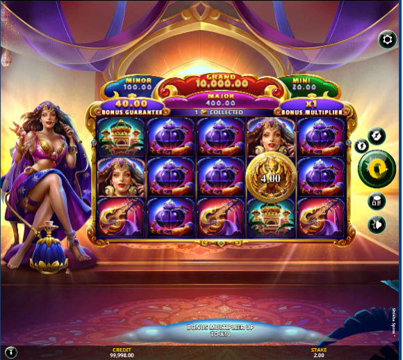 A compelling characteristic of Shisha Spins lies in its system of persistent base game modifiers: the Bonus Multiplier and the Bonus Guarantee. These values are displayed above the reels and are actively influenced by base game outcomes. Specifically, whenever a winning combination involves the high-value Dancer symbol (referred to as Princess in some game descriptions) during the base game, both the Bonus Multiplier and the Bonus Guarantee meters increment.