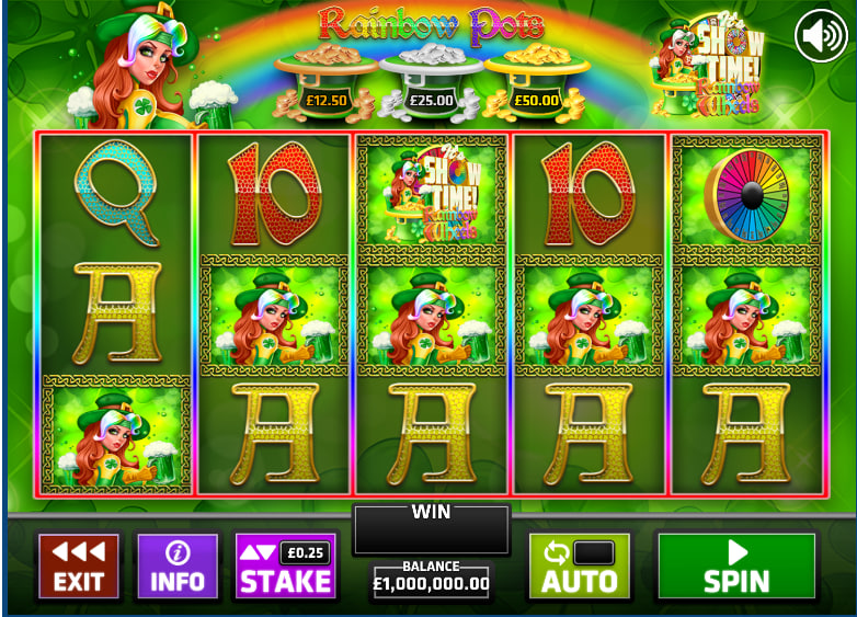 The symbols on the reels are a mix of classic playing card denominations (9, 10, J, Q, K, A) rendered in a style that fits the theme, and custom icons that are more directly tied to the Irish folklore. These include images of a cheerful leprechaun, a shamrock, and a pot of gold. The standout symbol is the “Show Time!” logo, which plays a crucial role in triggering the game's main bonus feature. The overall presentation is clean and well-executed, with animations that add a dynamic element to winning combinations and feature triggers.