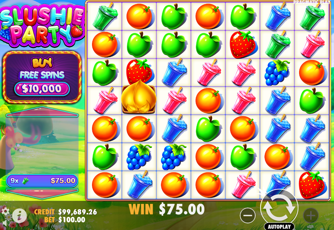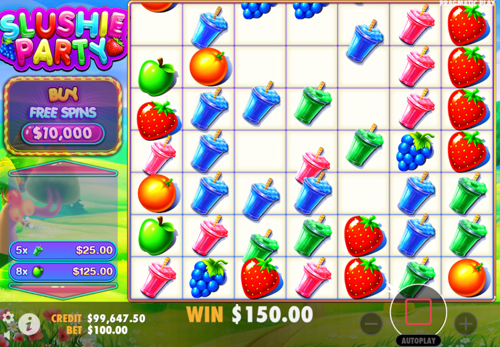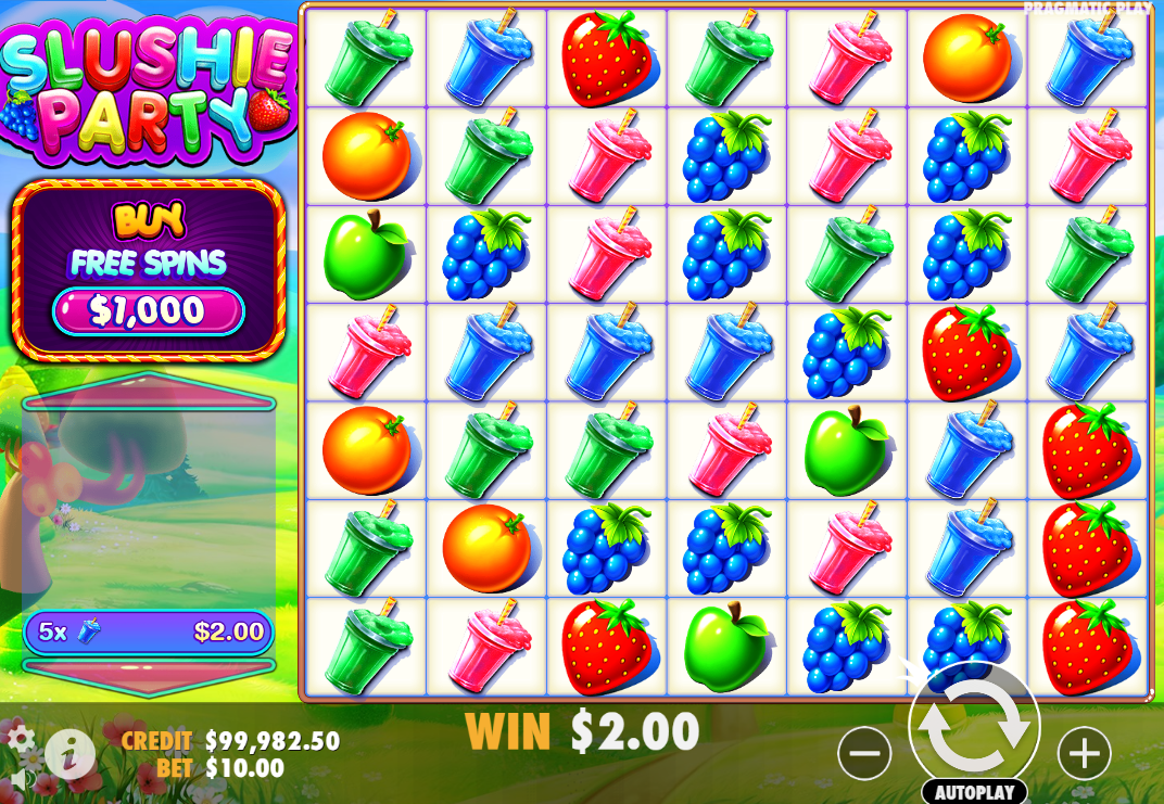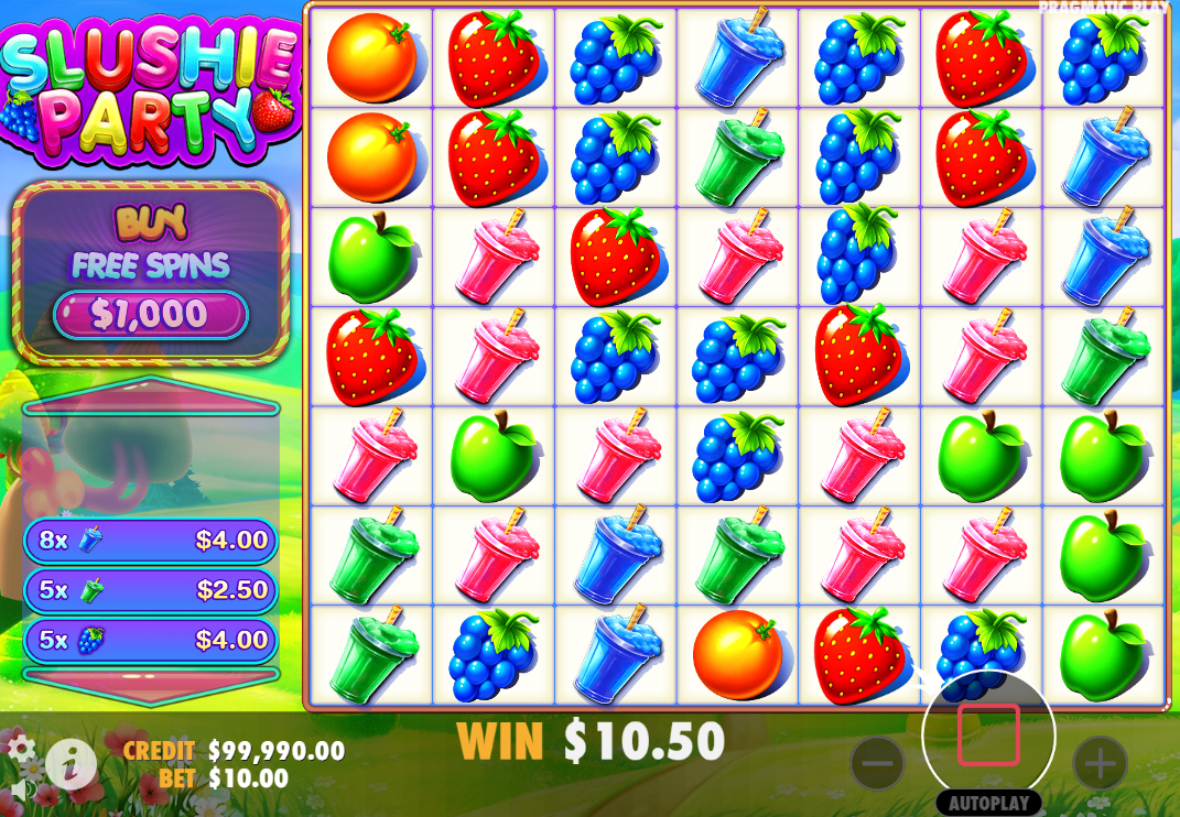In an interesting design choice, the traditional fruit symbols actually offer higher payouts than the titular slushies. The strawberry leads the pack, offering substantial rewards for larger clusters. Below that, oranges, apples, and grapes form the medium-paying tier, while the colorful slushies round out the lower end of the paytable.