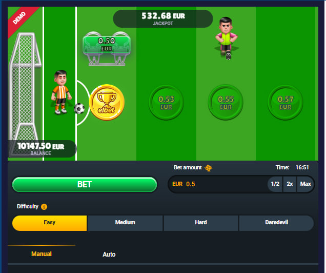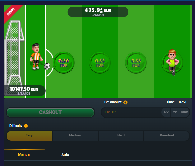 “Soccer Rush” immediately immerses the player in the electrifying atmosphere of a football match. The visual design is clean and modern, featuring a vibrant green pitch that serves as the playing field. Two animated players, one from your team and one from the opposition, flank the central play area. The goalposts and netting are clearly visible, grounding the experience in its soccer theme. The interface is intuitive, with essential controls like the bet amount, difficulty selection, and the crucial “Cashout” button readily accessible. The overall aesthetic is polished, avoiding excessive clutter to maintain focus on the core gameplay, while subtle animations and sound effectsโlike the distant roar of a crowd or the distinct ‘thwack' of a ballโenhance the immersive quality without being distracting. This dedication to theme is not merely cosmetic; it directly informs the gameplay, creating a cohesive and engaging experience for football aficionados and general players alike.