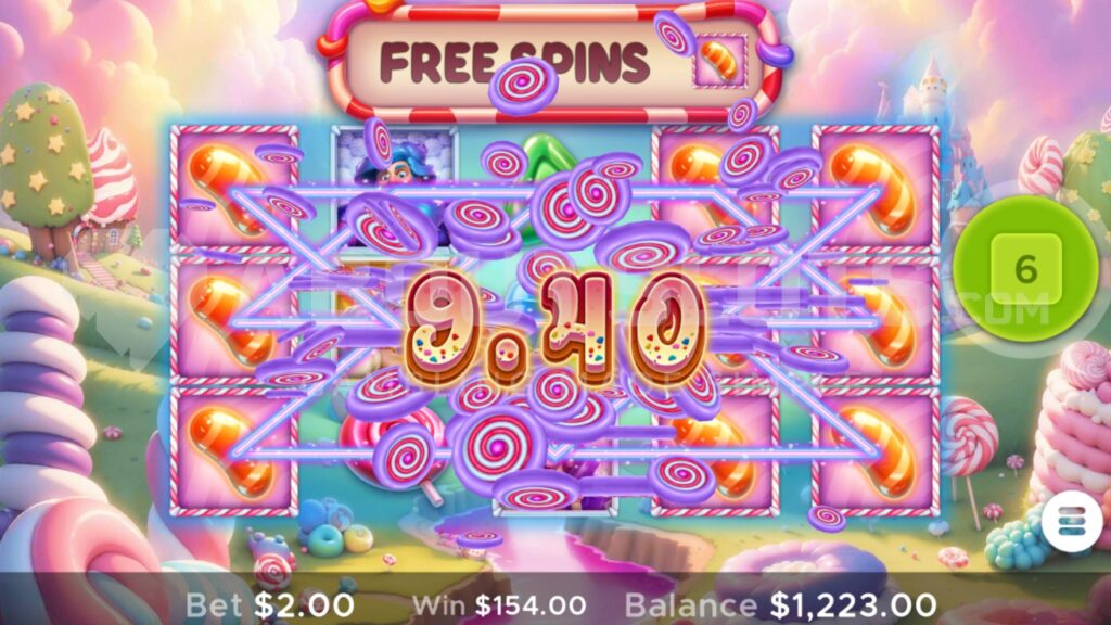 Low-paying symbols are stylized confections: a pink swirled candy, an orange striped candy, a green triangular candy, and a blue lollipop. These require a minimum of three matching symbols for a payout.